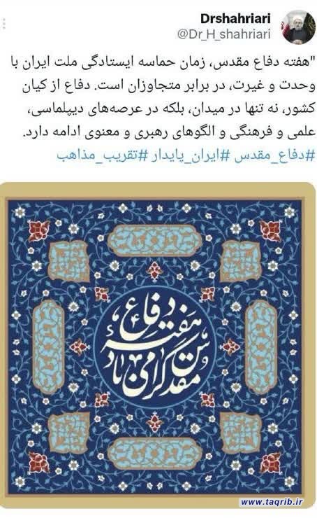 حجت الاسلام والمسلمین دکتر حمید شهریاری به مناسبت فرا رسیدن هفته دفاع مقدس در توییتر خود نوشت: هفته دفاع مقدس، زمان حماسه ایستادگی ملت ایران با وحدت و غیرت، در برابر متجاوزان است.